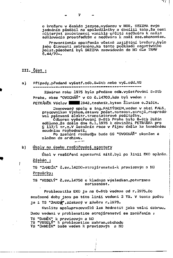 Závěrem roku 1975 byla předána odb.vyšetřování S-Stb Praha, akce "OVOCNÁŘ" v OS č. 14703, kde byl veden :