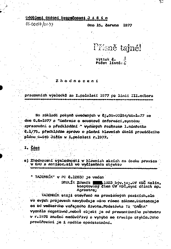 Zhodnocení pracovních výsledků za I. pololetí 1977 po linii III. odboru