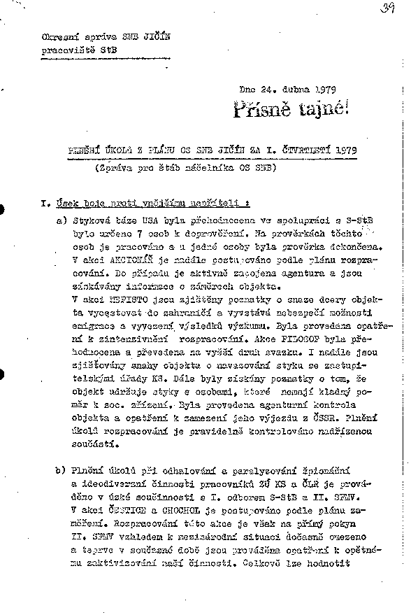 V akci MEFISTO jsou zjištěny poznatky o snaze dcery objekta vycestovat do zahraničí a vyvstává nebezpečí možnosti emigrace a vyvezení výsledků výzkumu. Byla provedena opatření k zintenzivnění rozpracování. Akce FILOSOF byla přehodnocena a převedena na vyšší druh svazku. I nadále jsou zjišťovány snahy objekta o navazování styku se zastupitelskými úřady KS. Dále byly získány poznatky o tom, že objekt udržuje styky s osobami, které nemají kladný poměr k soc. zřízení. Byla provedena agenturní kontrola objekta a opatření k zamezení jeho výjezdu z ČSSR. Plnění úkolů rozpracování je pravidelně kontrolováno nadřízenou součástí.