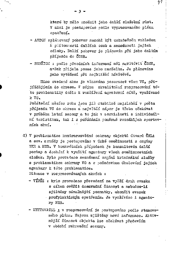 - BEDŘICH : podle původních informací měl navštívit ČSSR, avšak přijela pouze jeho manželka. Je plánováno jeho vytěžení při nejbližší návštěvě.