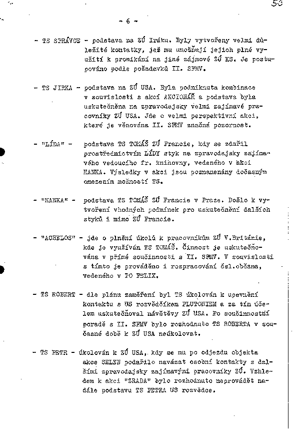 - TS JIRKA - podstava na ZÚ USA. Byla podniknuta kombinace v souvislosti s akcí AKCIONÁŘ a podstava byla uskutečněna na zpravodajsky velmi zajímavé pracovníky ZÚ USA. Jde o velmi perspektivní akci, které je věnována II. SFMV značná pozornost.