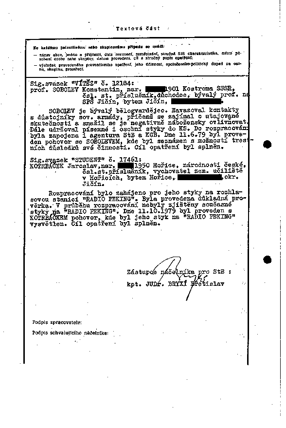 Rozpracování bylo zahájeno pro jeho styky na rozhlasovou stanici "RADIO PEKING". Byla provedena důkladná prověrka. V průběhu rozpracování nebyly zjištěny současné styky na "RADIO PEKING". Dne 11.10.1979 byl proveden s KOTRBÁČKEM pohovor, kde byl jeho styk na "RADIO PEKING" vysvětlen. Cíl opatření byl splněn.