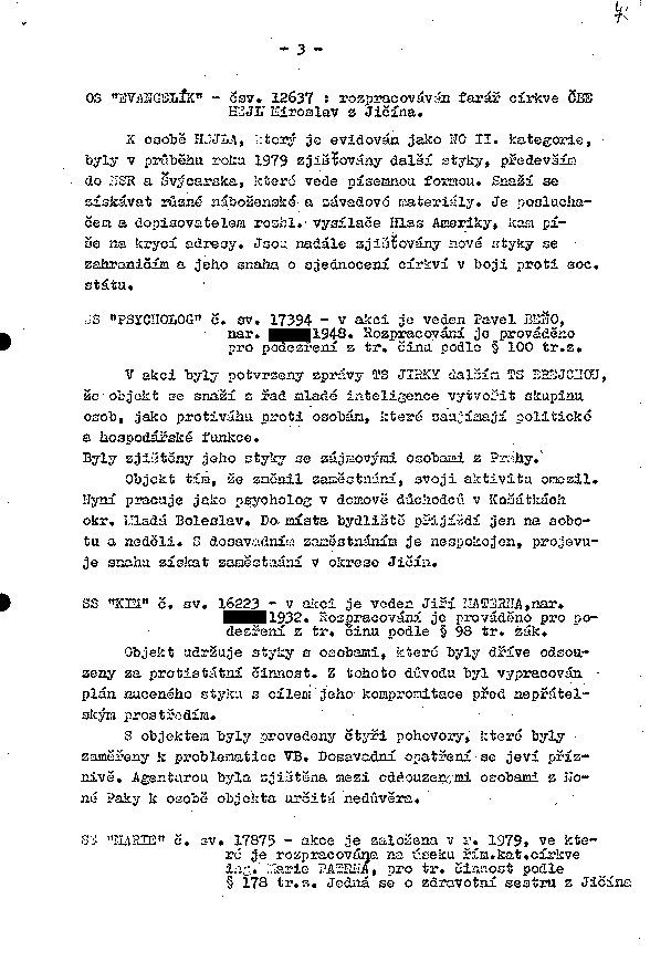 SS "MARIE" č. sv. 17875 - akce je založena v r. 1979, ve které je rozpracována na úseku řím.kat. církve ing. Marie PATRNÁ, pro tr. činnost podle § 178 tr.s. Jedná se o zdravotní sestru z Jičína