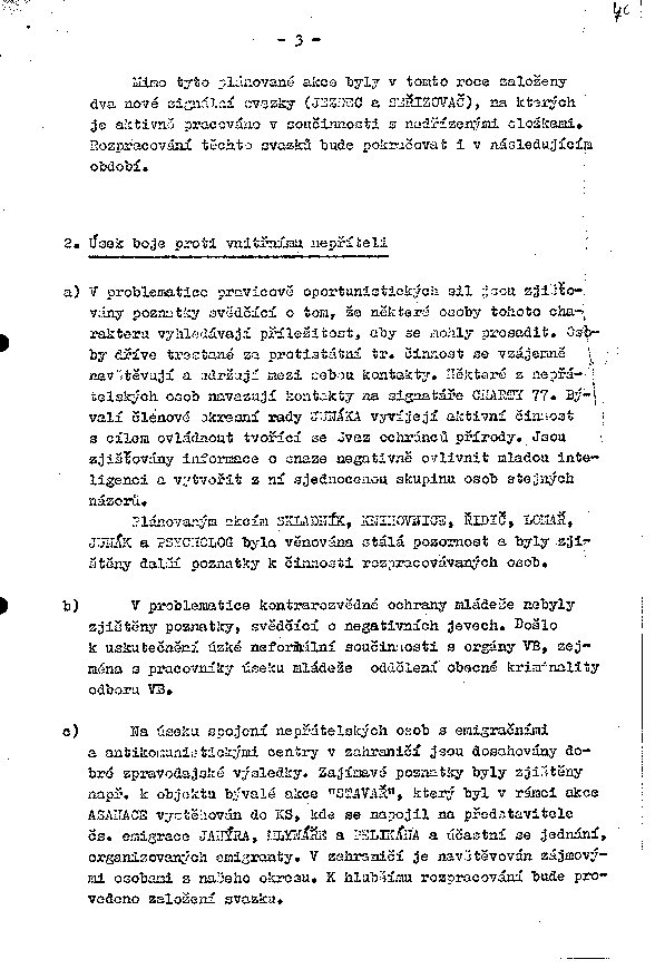a) V problematice pravicově oportunistických sil jsou zjišťovány poznatky svědčící o tom, že některé osoby tohoto charakteru vyhledávají příležitost, aby se mohly prosadit. Osoby dříve trestané za protistátní tr. činnost se vzájemně navštěvují a udržují mezi sebou kontakty. Některé z nepřátelských osob navazují kontakty na signatáře CHARTY 77. Bývalí členové okresní rady JUNÁKA vyvíjejí aktivní činnost s cílem ovládnout tvořící se Svaz ochránců přírody. Jsou zjišťovány informace o snaze negativně ovlivnit mladou inteligenci a vytvořit z ní sjednocenou skupinu osob stejných názorů.