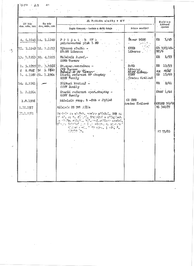 | 15. 7.1949 | 12. 1. 1953 | Výkonná služba - KV-NB Liberec | KVNB Liberec | KR 197/49- BP/6 |