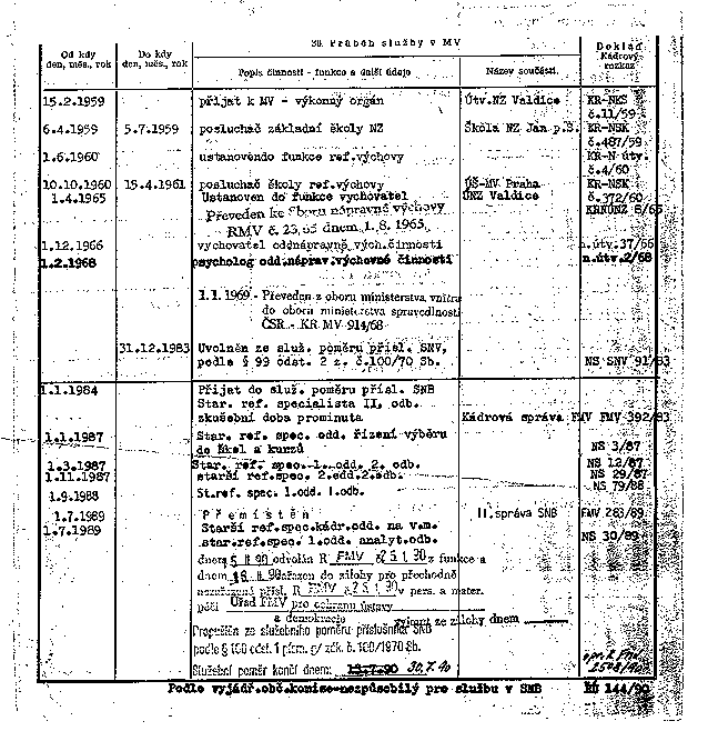 | 1.1.1984 | Přijat do služ. poměru přísl. SNB Star. ref. specialista II. odb. zkušební doba prominuta | Kádrová správa FMV | FMV 392/83 | |