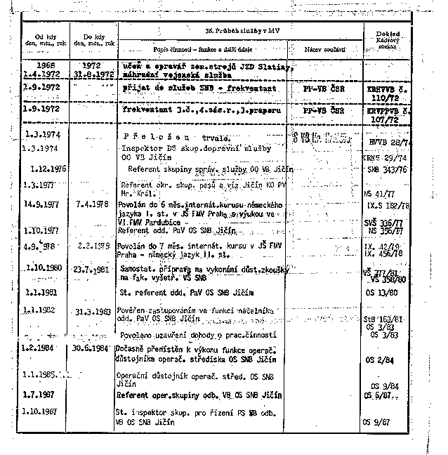 | 1.1.1982 | 31.3.1983 | Pověřen zastupováním ve funkci náčelníka odd. PaV OS SNB Jičín | StB 163/81 OS 3/83 | |