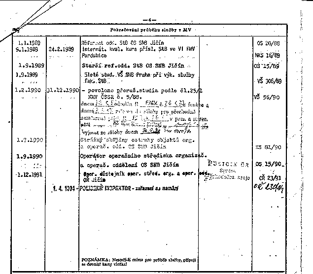 | 1.9.1990 | Operátor operačního střediska organizač. a operač. oddělení OS SNB Jičín | POLICIE ČR | OS 15/90 | |