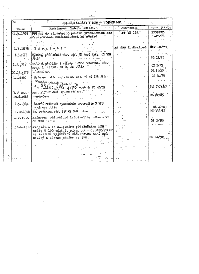 | 1.3.1979 | Dočasně přeložen k výkonu funkce referenta odd. hosp. krim. odb. VB OS SNB Jičín | OS 2/79 | ||