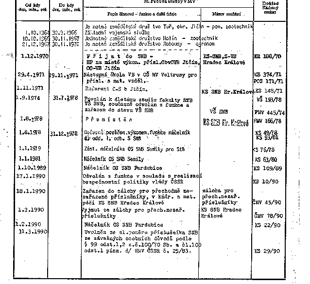 | 18.1.1990 | Zařazen do zálohy pro přechodně nezařazené příslušníky, v kádr. a mat. péči KS SNB Hradec Králové | záloha pro přech.nezař. příslušníky | ČMV 45/90 | |