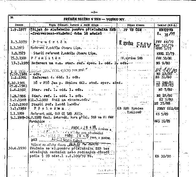 | 30.4.1990 | Uvolněn ze sl.poměru příslušníka SNB bez závažných osobních nebo rodinných důvodů podle § 99 odst.1 z.č.100/70 Sb. | KS 39/90 | |