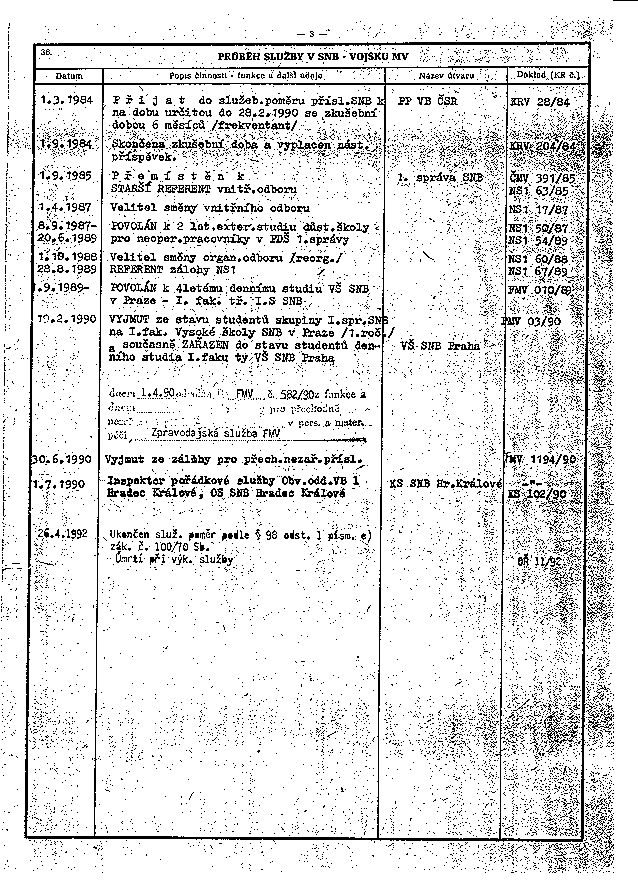 | 1.3.1984 | Přijat do služeb.poměru přísl. SNB k | PP VB ČSR | KRV 28/84 |