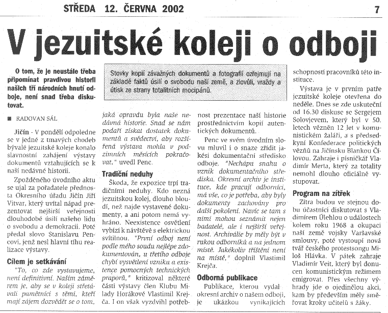 Jičín - V pondělí odpoledne se v jedné z tmavých chodeb bývalé jezuitské koleje konalo slavnostní zahájení výstavy dokumentů vztahujících se k naší nedávné historii.
