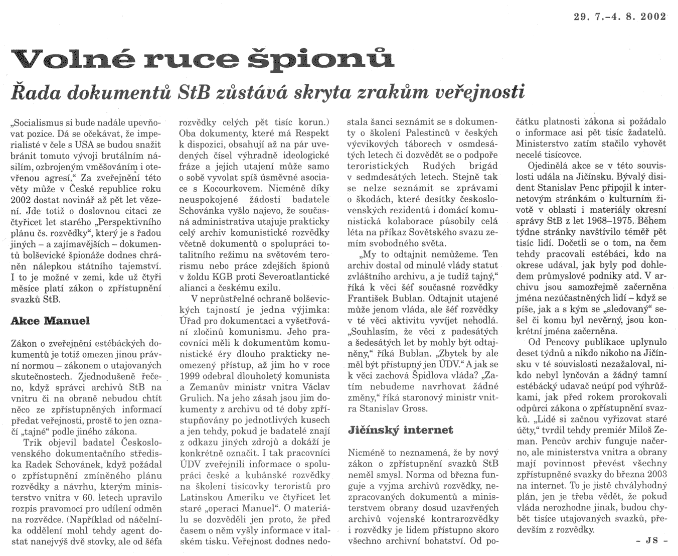 Od Pencovy publikace uplynulo deset týdnů a nikdo nikoho na Jičínsku v té souvislosti nezažaloval, nikdo nebyl lynčován a žádný tamní estébácký udavač neúpí pod výhrůžkami, jak před rokem prorokovali odpůrci zákona o zpřístupnění svazků. "Lidé si začnou vyřizovat staré účty," tvrdil tehdy premiér Miloš Zeman. Pencův archiv funguje načerno, ale ministerstva vnitra a obrany mají povinnost převést všechny zpřístupněné svazky do března 2003 na Internet. To je jistě chvályhodný plán, jen je třeba vědět, že pokud vláda nerozhodne jinak, budou chybět tisíce utajovaných svazků, především z rozvědky.