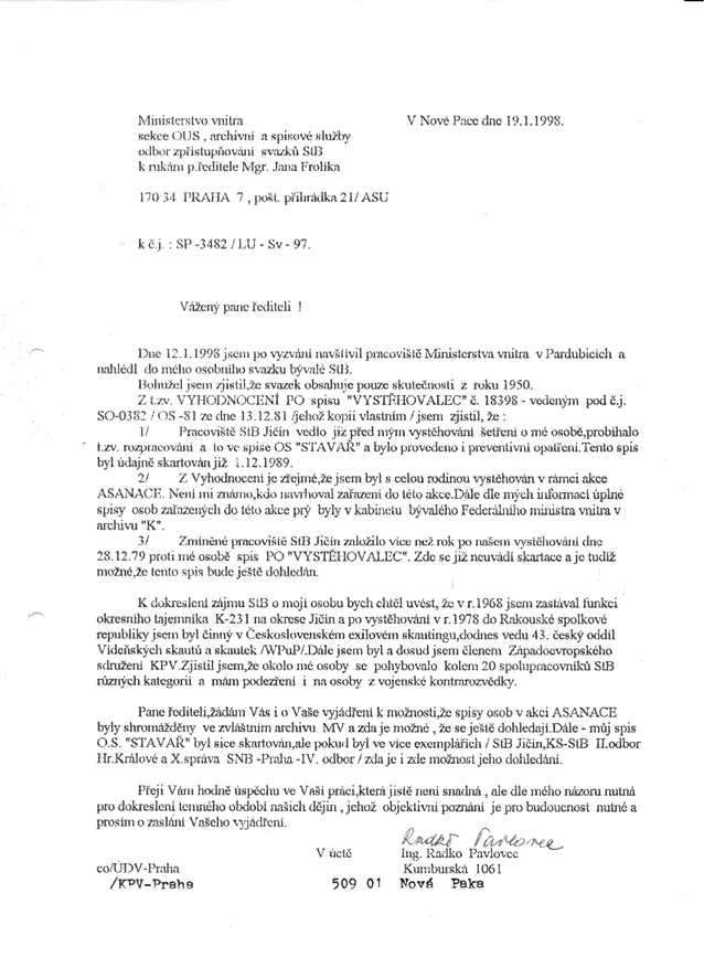 Pane řediteli, žádám Vás i o Vaše vyjádření k možnosti, že spisy osob v akci ASANACE byly shromážděny ve zvláštním archivu MV a zda je možné, že se ještě dohledají. Dále – můj spis O.S. "STAVAŘ" byl sice skartován, ale pokud byl ve více exemplářích (StB Jičín, KS-StB II. odbor Hradec Králové a X. správa SNB – Praha – IV. odbor) zda je i zde možnost dohledání.