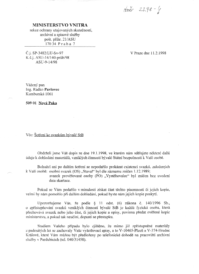 Bohužel ani po dalším šetření se nepodařilo prokázat existenci svazků, založených k Vaší osobě: osobní svazek (OS) "Stavař" byl dle záznamu zničen 1.12.1989;