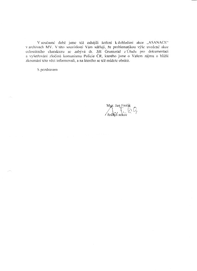 V současné době jsme též zahájili šetření k dohledání akce "ASANACE" v archivech MV. V této souvislosti Vám sděluji, že problematikou výše uvedené akce celostátního charakteru se zabývá dr. Jiří Gruntorád z Úřadu pro dokumentaci a vyšetřování zločinů komunismu Policie ČR, kterého jsme o Vašem zájmu o bližší zkoumání této věci informovali, a na kterého se též můžete obrátit.