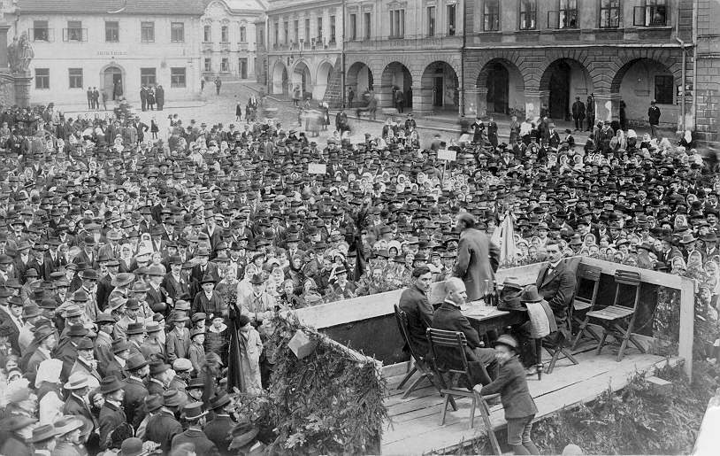 Nálada všeho občanstva byla neobyčejně povznesená a radostná. Mezitím naplnilo se náměstí pod loubími i na volné ploše a bylo možno pozorovati, jak vlna nadšení sbližuje ty, mezi něž dříve stavěla hráz rozdílnost stavu. Debatovalo se o budoucnu, a to povětšině optimisticky. V půl páté počal se dav řaditi u školy a v 5 hodin konán průvod městem. Napřed šly školní děti, pak sokolstvo, zastupitelstvo obce, dělnictvo a četníci. V průvodu neseny četné lampióny, ale bez svíček, poněvadž nebyly k dostání, taková byla po válce ve všem bída. Průvod čítal asi 2000 lidí a veden byl hlavní ulicí k nádraží, pak zpět na náměstí, kde s balkonu budovy okresního soudu pronesl starosta města řeč, v níž nastínil význam dne, nabádal ke svornosti a přečetl legionářskou báseň Chemin de dames. Tím oslava ukončena, na náměstí však ještě dlouho bylo živo."