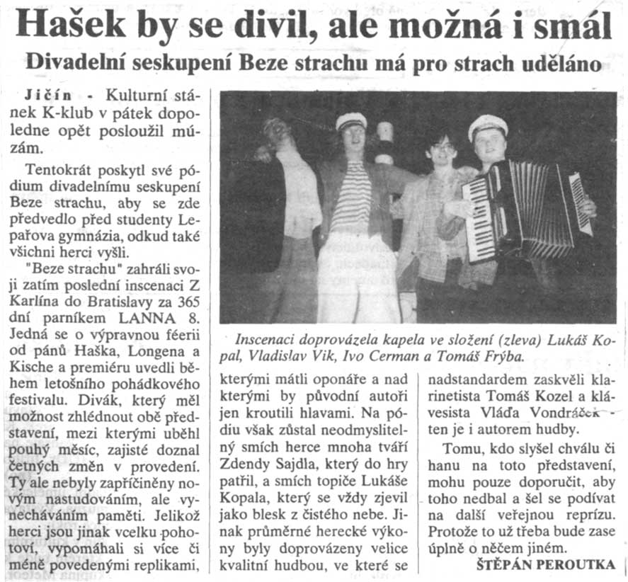 "Beze strachu" zahráli svoji zatím poslední inscenaci Z Karlína do Bratislavy za 365 dní parníkem LANNA 8. Jedná se o výpravnou féerii od pánů Haška, Longena a Kirsche a premiéru uvedli během letošního pohádkového festivalu. Divák, který měl možnost zhlédnout obě představení, mezi kterými uběhl pouhý měsíc, zajisté doznal četných změn v provedení. Ty ale nebyly zapříčiněny novým nastudováním, ale vynecháváním paměti. Jelikož herci jsou jinak vcelku pohotoví, vypomáhali si více či méně povedenými replikami, kterými mátli oponáře a nad kterými by původní autoři jen kroutili hlavami. Na pódiu však zůstal neodmyslitelný smích herce mnoha tváří Zdendy Sajdla, který do hry patřil, a smích topiče Lukáše Kopala, který se vždy objevil jako blesk z čistého nebe. Jinak průměrné herecké výkony byly doprovázeny velice kvalitní hudbou, ve které se nadstandardem zaskvěli klarinetista Tomáš Kozel a klávesista Vláďa Vondráček – ten je i autorem hudby.